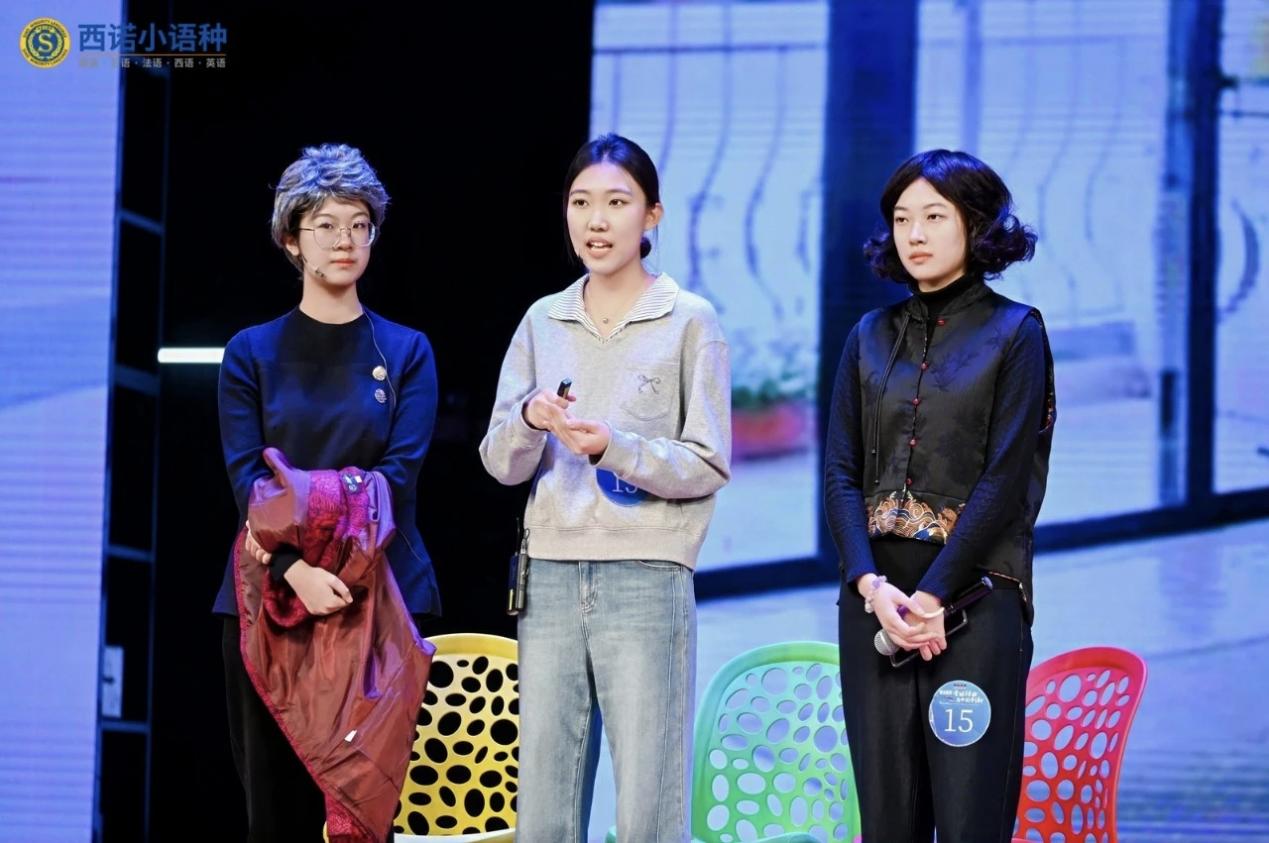 我校参赛团队的原创德语短剧《Gleißende Abendsonne: Neue Lebensmodelle für Senioren zwischen Stadt und Land》(中文名《夕阳同辉:城乡对话里的银发新生活》)生动展示了中国在养老服务、医疗康养、老年教育等领域的创新实践,以青年视角诠释了可持续发展与银发经济的时代内涵。三位选手台风稳健、表达流畅、配合默契,面对评委提问,逻辑清晰、对答如流,表现出优秀的临场应变能力与综合素养。
