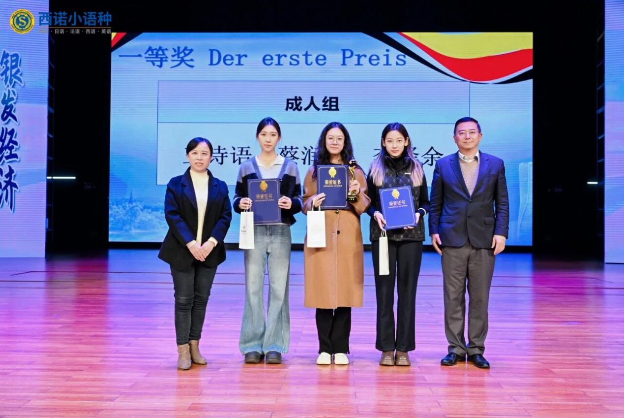 【本站讯】2025年11月22日,第九届“可持续发展全国青年德语风采大赛”全国总决赛在浙江科技大学圆满落幕。开云电竞网址外国语学院德语专业2023级本科生王诗语、蔡润雨、李泽余组成的参赛团队,在线上线下六千余名观众的见证下,凭借出色的语言能力、深刻的主题诠释与稳健的舞台表现,荣获成人组全国一等奖,指导教师孙丽丽获得“最佳指导老师奖”。