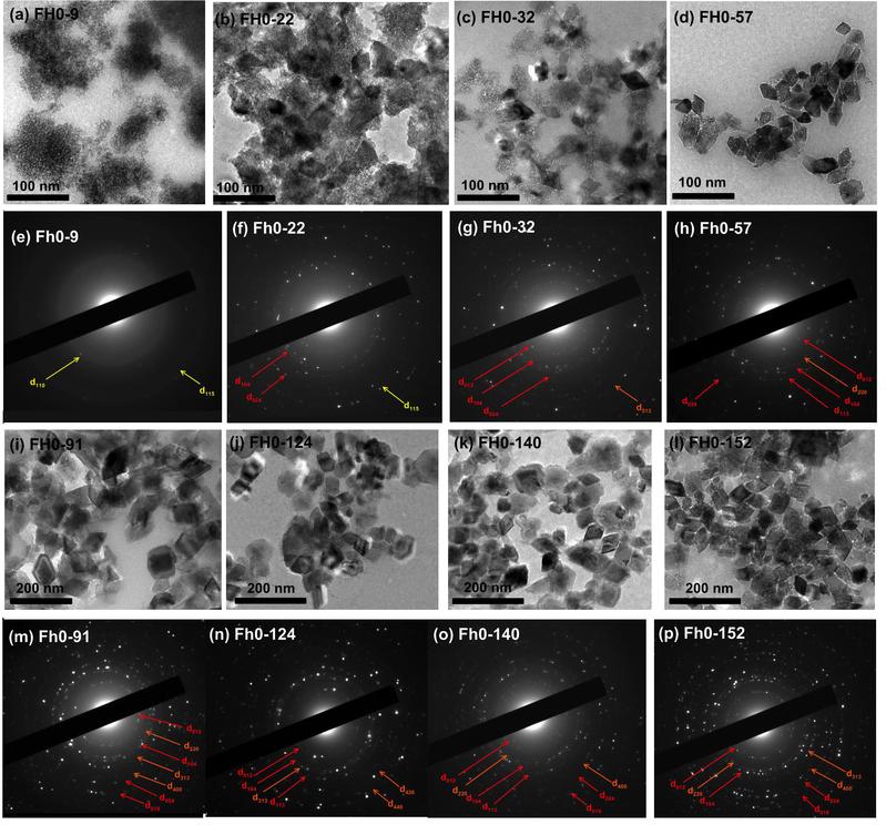 图2. 五阶段样品的透射电镜结果,其中黄色、红色和橙色箭头分别指示水铁矿、赤铁矿和磁赤铁矿晶环