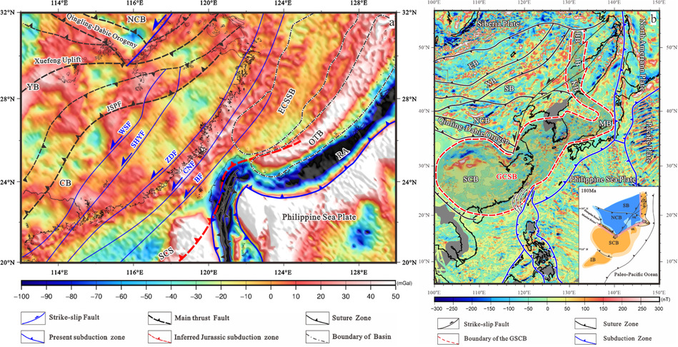 由于受(古)太平洋板块俯冲影响,华南东部洋陆过渡带地质情况十分复杂,尤其是燕山期古太平洋板块俯冲的位置等问题一直存在着争议。该成果根据最新的地球物理资料,对重力异常资料进行小波分解,对磁异常资料进行延拓处理,反演了华南东部洋陆过渡带的莫霍面,在地球物理场上清晰识别了该区的断裂体系,并识别出侏罗纪俯冲带的位置以及现今俯冲带的位置(图1a),说明了中生代以来,华南东部洋陆过渡带的俯冲经历了由西向东的迁移。