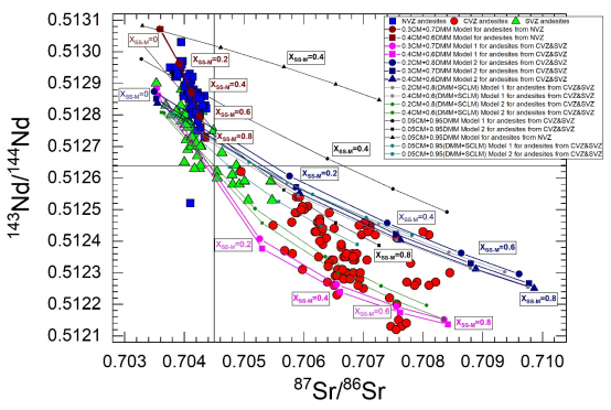 通过系统分析南美安第斯弧北、中、南段安山岩的地球化学特征及前人研究工作,发现:除了极少数中安第斯的安山岩之外,绝大部分安山岩的富集特征不能通过传统认为的亏损的幔源玄武质岩浆分异及与富集的大陆弧地壳的相互作用得到,它们的Sr-Nd同位素组成虽然不同程度富集,但都不随SiO2含量的变化而变化(图1);相反,这一富集特征最可能继承自它们的地幔源区。