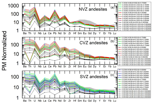 图4. 关键不相容元素的原始地幔标准化蛛网图展示微量元素模拟结果。