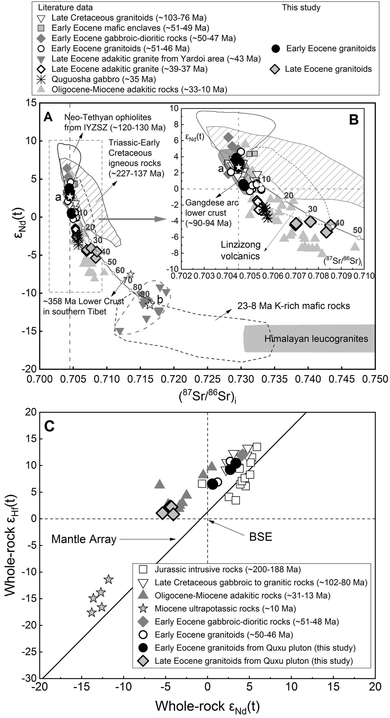 本文通过对西藏南部冈底斯造山带始新世花岗质岩石的锆石U-Pb年龄、Hf同位素、全岩主微量元素、Sr-Nd-Hf同位素和矿物O同位素的综合研究,对这一假说进行了检验。结果表明,根据侵位年龄和地球化学特征,可将这些岩石分为两组。第一组花岗岩SiO2含量较低,为59.82 ~ 64.41 wt%,侵位于ca. 50 ~ 48 Ma的早始新世; 第二组花岗岩SiO2含量较高,为63.93 ~ 68.81 wt%,侵位于ca. 42 Ma的晚始新世。早始新世花岗岩类全岩Sr-Nd-Hf同位素组成相对亏损,(87Sr/86Sr)i值较低(0.7044~0.7048),具有正的eNd(t)值 (0.6~3.9)和eHf(t)值(6.5~10.5),锆石eHf(t) 值从1.6变化到12.1,锆石δ18O值为5.28 ~ 6.26‰。这些同位素特征与冈底斯造山带晚白垩世基性弧火成岩极为相似,表明其来源于新生基性弧地壳的部分熔融。相对于始新世早期花岗岩,始新世晚期花岗岩的MgO、Fe2O3、Al2O3、HREE含量较低,K2O、Rb、Sr、Th、U、Pb含量较高,Sr/Y、(La/Yb)N比值较高。全岩Sr-Nd-Hf同位素组成较富集,表现为较高的(87Sr/86Sr)i值 (0.7070~0.7085),负的eNd(t)值 (-5.2 ~ -3.9),较低的eHf(t)值(0.9 ~ 2.3); 它们的锆石eHf(t)值也较低(-2.8 ~ 8.0),但锆石δ18O值稍高(6.25 ~ 6.68‰)。 综合分析这些地球化学特征,我们认为新生弧地壳和古陆壳的叠加熔融形成了晚始新世花岗岩类。
