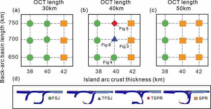 数值模拟结果发现在新几内亚-所罗门地区的发育的三条俯冲带体系受控于岛弧的厚度、弧后盆地和洋陆过渡带的宽度,以及洋陆过渡带中预先存在的岩石圈弱点。本次研究发现了四种不同的演化模式(图2):1)双俯冲模型,包括俯冲同向跃迁模型(FSJ)和俯冲极性反转模型(SPR);2)平行的三俯冲模型,包括倾向同向跃迁的模型(TFSJ)和倾向极性反转的模型(TSPR)。