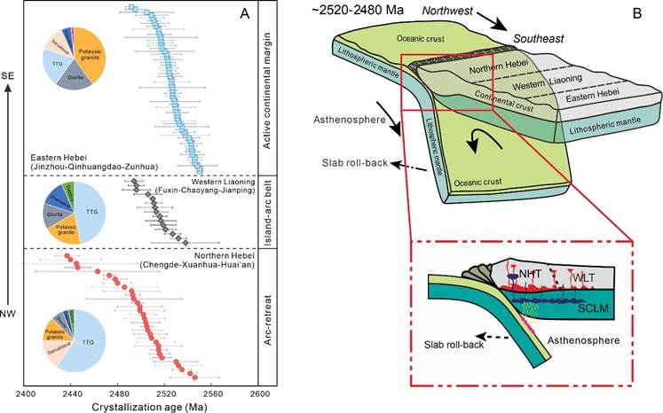 图2. (A) 冀北-辽西-冀东新太古代晚期-古元古代早期火成岩时空分布和岩性组合图;(B) 华北克拉通北部新太古代晚期构造演化模式图
