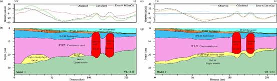图3 下地壳高速层不连续分布和连续分布两种模式的重力模拟结果对比