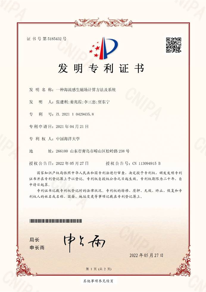 教育部重点实验室海洋磁场仿真研究获得一项国家发明专利