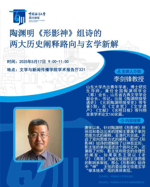 研究生百川讲坛 | 第485讲 李剑锋:陶渊明《形影神》组诗的两大历史阐释路向与玄学新解