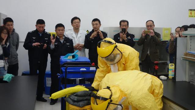 为进一步提升我校实验室安全管理水平,提高广大师生的安全意识,增强防范与处置实验室突发环境事件能力,10月26日下午,国有资产与实验室管理处在我校鱼山校区举办了实验室突发环境事件应急演练,食品科学与工程学院、水产学院、海洋生命学院、医药学院等60余名师生参加了此次活动,青岛市环境保护局市南分局、青岛市公安局市南分局有关领导和专家到场观摩并进行了现场指导。