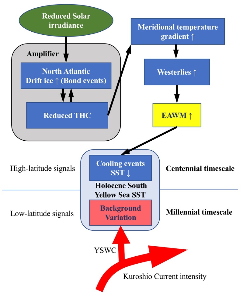 In the modern times, the Yellow See surface water temperature is affected by both the high-latitude EAWM and low-latitude Kuroshio current at the same time. However, the evolution mechanism of the Yellow See surface water temperature still remains highly contentious. Dr.JIA Yonghao and others reconstructed the interdecadal surface water temperature records using two sedimentary cores located in the South Yellow See. By comparing the records of Kuroshio current, EAWM, North Atlantic Drift ice and things like that, there comes the idea that the Yellow See surface water temperature during the Holocene is affected by high-and-low latitude forcingon at the same time, and different forcingons exert chief influence on different timescales. The Yellow See water temperature in Millennial timescale is mainly under the influence of Kuroshio current, and in Centennial timescale, the EAWM. This is answer to the climate signals of North Atlantic Cold Event (Bondcycle).