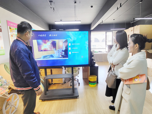 调研伊始,公司创始人王观龙先生带领师生团队参观了领客文化的城市IP和文创产品陈列区。从青岛城市IP“青青侠”、西藏日喀则“青小稞”到抚州“戏宝梦娃”,一系列兼具地域特色与创意的文创作品令师生们驻足细品;企业技术人员还通过PPT展示了AR互动打卡设备、雷达实时动作捕捉等技术在文化产业的应用,并介绍了公司最新研发的数字导诊机器。