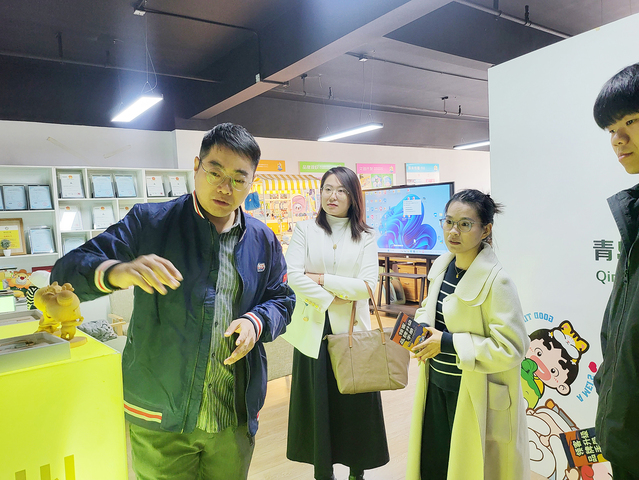 参观结束后,双方在会议室座谈交流。王观龙先生首先介绍了企业概况,领客文化2016年成立,是城阳区首家文化类高新技术、专精特新及规上企业。公司深耕“文化+科技”领域近十年,形成了IP设计运营等五大业务板块,完成了北京大熊猫数字艺术展等千万级标杆项目,并参与了《海尔兄弟》新版动画等创作。此外,公司还发起成立了“中国地域吉祥物IP联盟”,联合国内9家知名地域IP运营单位,推动地域文化IP规范化和规模化发展。