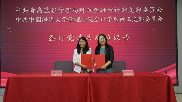 随后,蓝谷管理局综合部党支部与管理学院旅游农经教工党支部、蓝谷管理局党群工作部与管理学院工商管理系教工党支部、蓝谷管理局科技创新与投资促进部与管理学院营销与电子商务系教工党支部、蓝谷管理局财政金融审计部与管理学院会计学系教工党支部分别签订《党建结对共建协议书》。此外,青岛海科控股有限公司与中国海洋大学管理学院签订师资培训、学员实训等合作协议书,进一步拓宽校地合作维度。