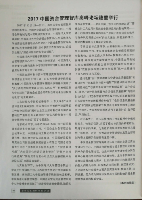 《会计之友》2017年报道:2017中国资金管理智库高峰论坛隆重举行