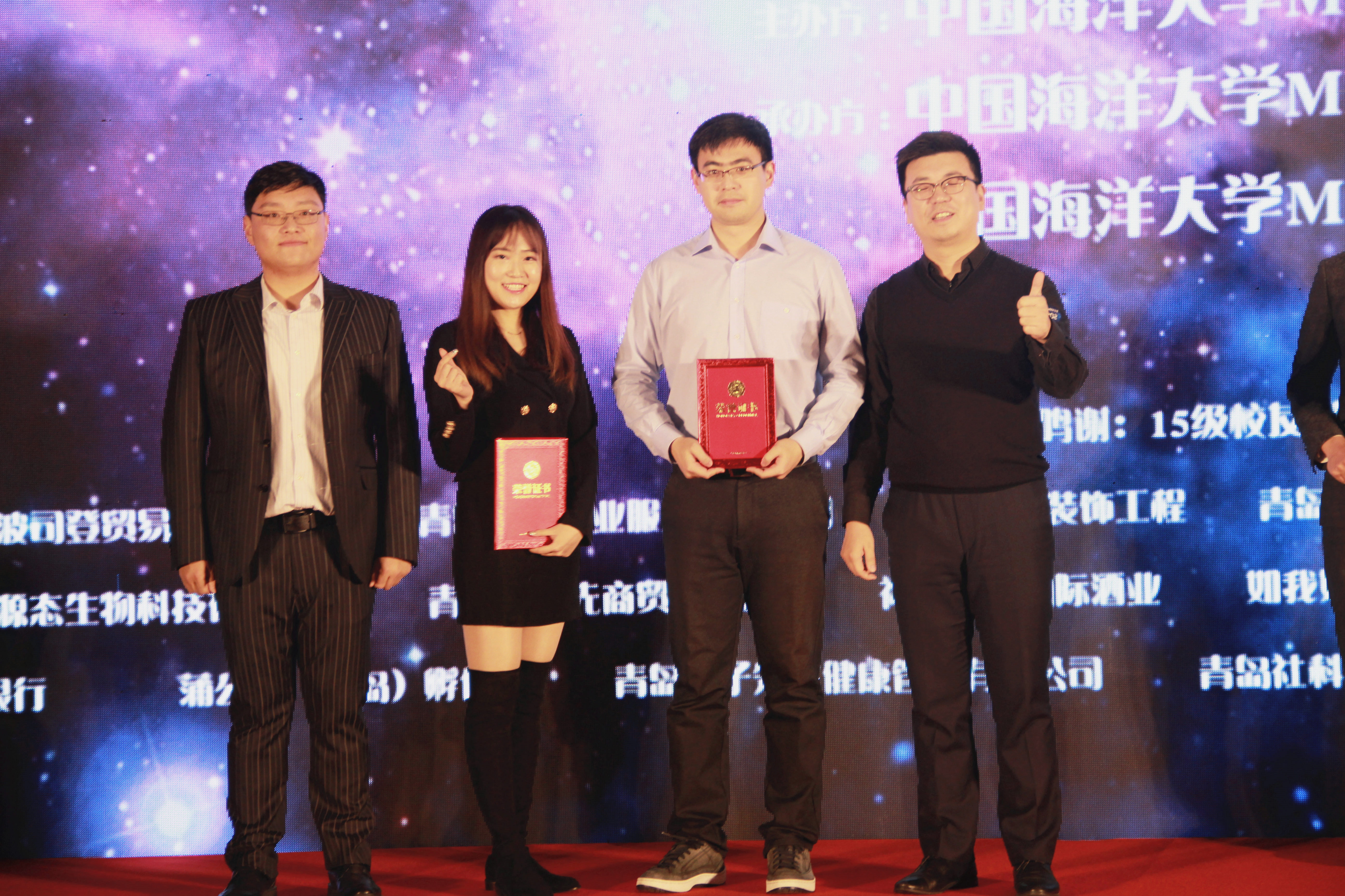 今天的欢声笑语离不开前辈们辛勤的付出,接下来颁发了“第九届联合会突出贡献奖”,荣获突出贡献领奖的分别是第九届MBA联合会主席李晓艳、第九届MBA联合会副主席车延超、第九届MBA联合会副主席杜鹏,由第十届MBA联合会主席团成员王智、赵国锋、季晓宇为前辈颁奖致谢。