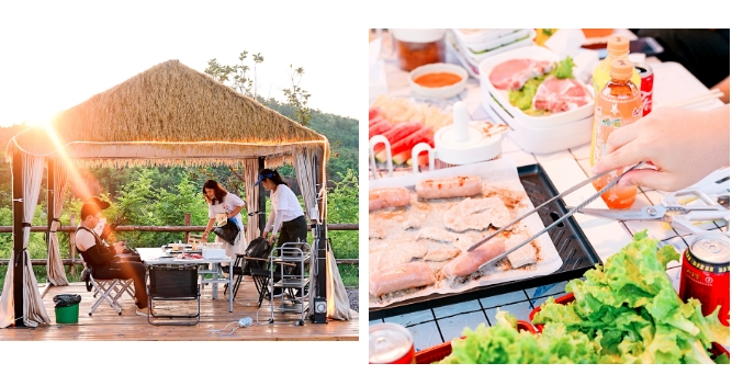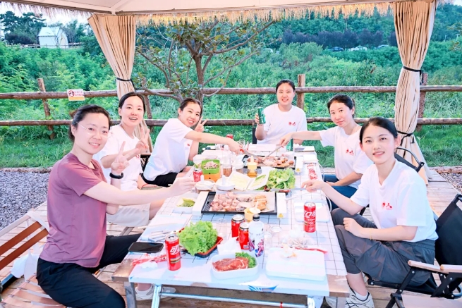 拓展训练后,同学们分组聚集在一起,在夕阳中体验了露营烧烤的乐趣。