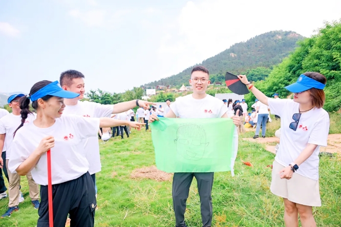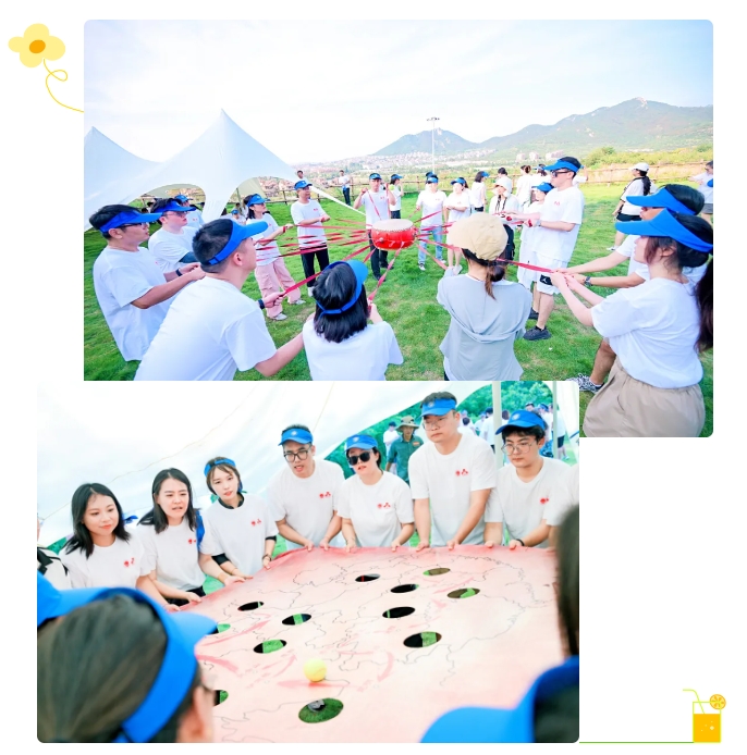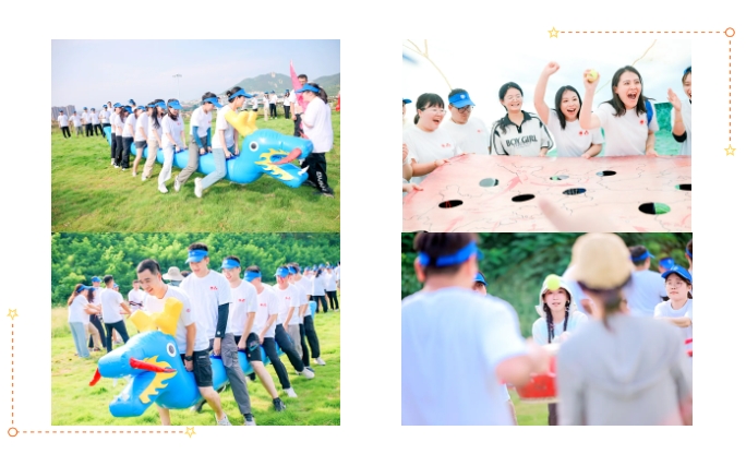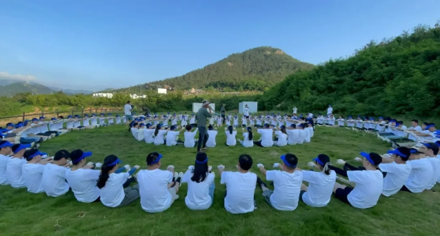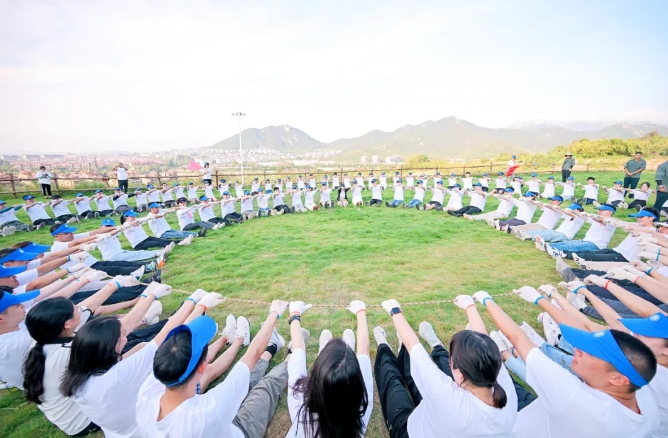 大家汇聚在草坪上进行了破冰分组,后分头进行了考验团结协作的旱地龙舟、团队战鼓,验证心沉手稳的重走长征路、动力圈等活动。