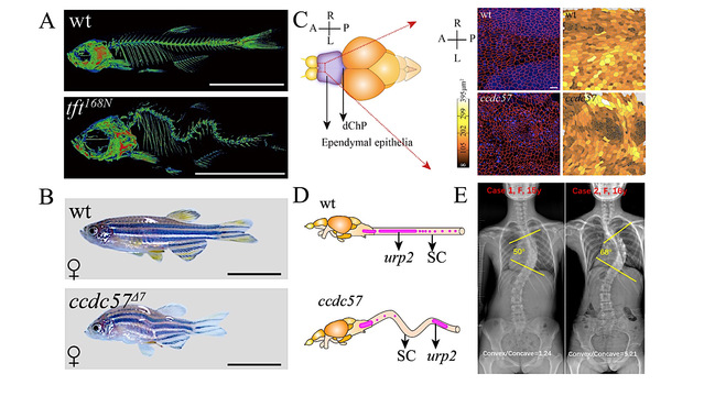 图1 斑马鱼脊柱侧弯突变体与发生脊柱侧凸的青少年患者