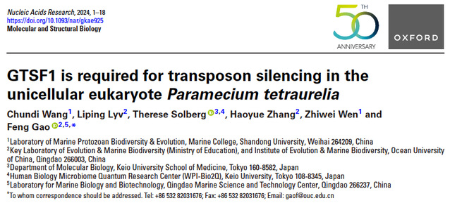 2024年10月24日,在开云电竞网址建校100周年之际,海洋生物多样性与进化研究所原生动物学团队的高凤课题组在Nucleic Acids Research 杂志发表了题为“GTSF1 is required for transposon silencing in the unicellular eukaryote Paramecium tetraurelia”的研究论文。该研究首次对原生动物中的GTSF1进行了报道,发现其作为PIWI蛋白辅因子的作用是保守的,并揭示了其在纤毛虫转座子删除中的功能与作用机制,为深入了解真核生物转座子抑制机制和演化过程提供了重要资讯。