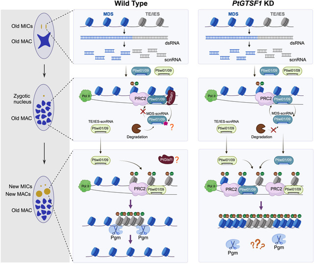 本研究鉴定到了与piRNA命运决定相关的GTSF1。GTSF1与PIWI和PRC2相互作用,并与非转座子piRNA-PIWI复合体上标记的添加相关。缺失GTSF1时,非转座子piRNA与母代体细胞核基因组比对后无法被标记,亦不能被降解,导致由piRNA指导的PRC2复合体以及组蛋白甲基化(H3K9me3与H3K27me3)定位均发生改变,H3K9me3与H3K27me3在转座子上的特异性富集分布消失,并进一步导致转座子删除进程变慢。该工作为进一步探究piRNA的选择与标记提供了重要数据,也为解析纤毛虫中piRNA介导的转座子删除机制提提供了新资讯。