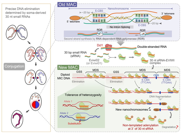 为了进一步探究这些序列被精确删除的分子机制,课题组成员鉴定了一类在有性生殖时期特异性合成的~30-nt 小RNA,研究发现这些小RNA来自母代体细胞核,其前体长链非编码RNA的转录,起始于母代体细胞核染色体末端亚端粒区的一个高度保守的染色体断裂位点(5′-TTGAA-3′)。这些前体被Dicer-like核酸内切酶1(Dcl1)切割成长度约为30 nt的小RNA,形成整个体细胞核基因组的缓存副本。进一步的实验证明,这些成熟的小RNA能够精确靶向并保护发育中子代体细胞核的同源DNA片段,而没有被小RNA保护的转座子等生殖系特异DNA片段则被全部删除,从而实现转座子的抑制和遗传信息的精准跨代传递。该发现进一步揭示了小RNA系统的灵活性——既能适应不同长度的RNA片段,又可兼容基因组杂合位点,这可能有助于物种在进化过程中维持遗传多样性。
