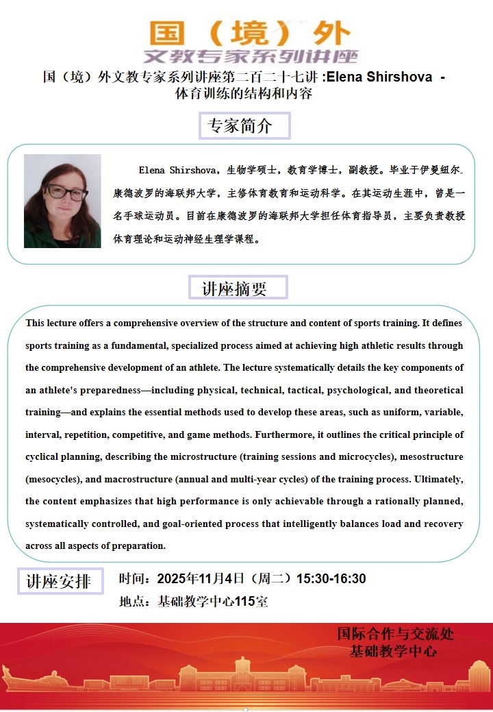 国(境)外文教专家系列讲座第二百二十七讲 :Elena Shirshova - 体育训练的结构和内容