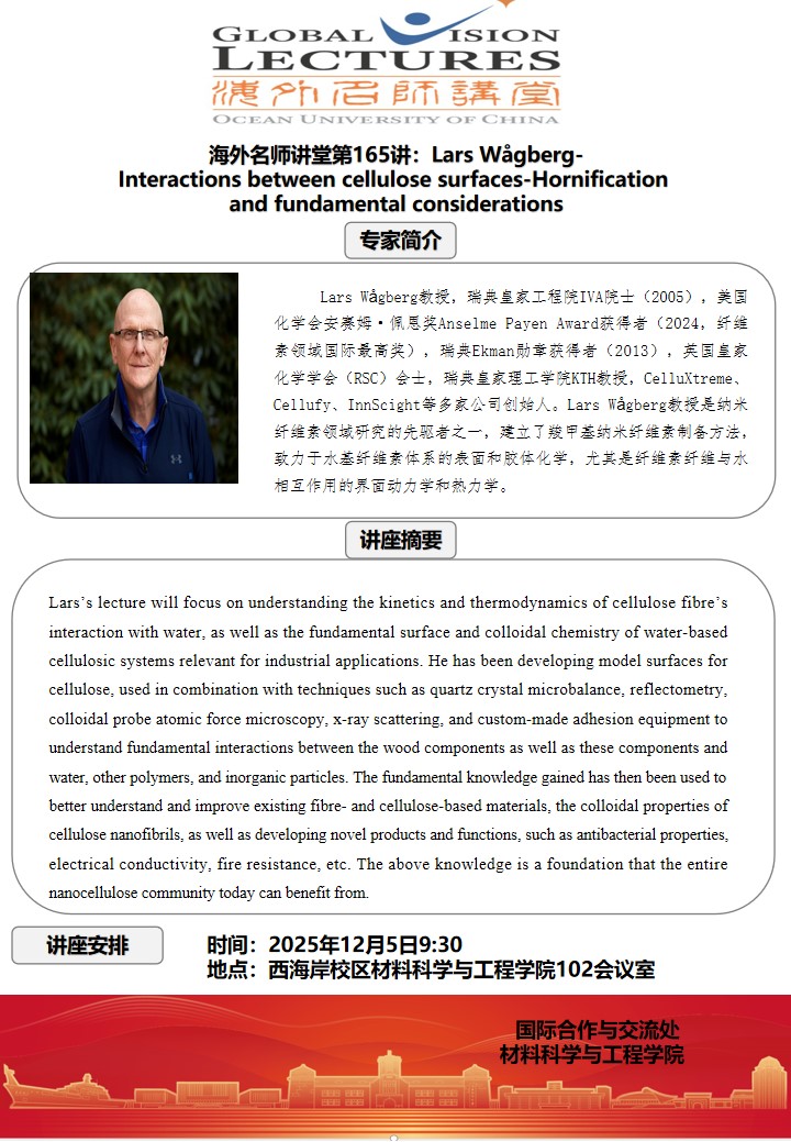 海外名师讲堂第一百六十五讲:Lars Wågberg-Interactions between cellulose surfaces-Hornification and fundamental considerations