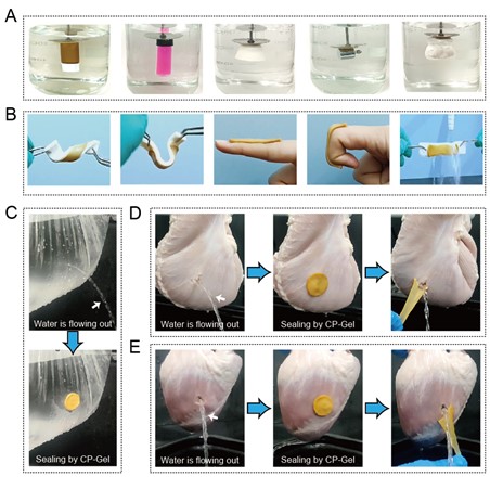 图1:CP-Gel的粘附性能。(A) CP-Gel可在水下粘附并提起玻璃、塑料、橡胶、金属和猪组织;(B) CP-Gel耐受皮肤的弯曲扭转并适应关节运动,并可抵抗水流冲刷;(C)CP-Gel可快速封堵正在流水的塑料袋;封闭有液体流出的猪胃(D)和猪心脏(E)。