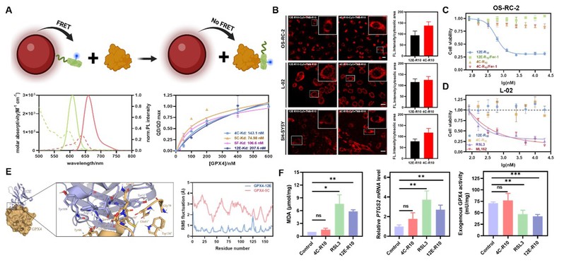 该研究利用GPX4重组蛋白免疫双峰驼,构建噬菌体文库制备靶向GPX4纳米抗体,利用荧光共振能量转移和表面等离子共振等多种分析技术高效筛选具有对GPX4高亲和力纳米抗体,利用细胞穿膜肽作为辅助手段,在细胞水平筛选具有诱导细胞铁死亡活性的纳米抗体。其中纳米抗体12E具有较强的细胞铁死亡诱导活性(IC50=0.56 μM),同时可以被铁死亡抑制剂Fer-1逆转,对正常细胞毒性较小,表现出良好的选择性。分子对接、分子动力学模拟以及GPX4突变体和12E的亲和力的测定结果均显示,12E特异性结合在GPX4的活性位点,通过正构调节直接抑制GPX4活性。在使用12E-R10进行细胞水平的铁死亡相关生物学指标检测过程中发现,12E-R10孵育细胞后,胞内的丙二醛(MDA)和前列腺素合成酶2(PTGS2)mRNA水平均显著升高。除此之外,12E-R10可以明显抑制外源GPX4WT的活性,这进一步验证了12E具有诱导细胞铁死亡的活性。(图2)