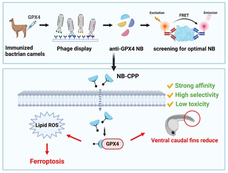 铁死亡是近年来定义的一种新型细胞死亡形式,其特征是由于不受限制的脂质过氧化和随后的膜损伤导致的铁依赖性细胞死亡。越来越多的研究表明,铁死亡在肿瘤、神经退行性疾病和组织缺血再灌注损伤等病理过程中发挥着重要作用。谷胱甘肽过氧化物酶4(Glutathione peroxidase 4, GPX4)是细胞铁死亡的关键靶点,经药物治疗的肿瘤细胞耐药株的生存高度依赖GPX4,因此GPX4抑制剂被视为解决肿瘤耐药问题的重要途径。但GPX4的活性位点附近结构相对扁平,是一个较难成药的靶点,开发GPX4的小分子抑制剂具有非常大的挑战。目前GPX4的小分子抑制剂大多存在生物利用度低、选择性较差等问题,亟需开发新型GPX4抑制剂。近日,开云电竞网址医药学院邱雪课题组与合作者在化学综合性期刊《Chemical Science》发表了一篇题为“A Potent and Selective Anti-Glutathione Peroxidase 4 Nanobody as Ferroptosis Inducer”的研究论文,开发了一种可以通过靶向GPX4诱导肿瘤细胞发生铁死亡的纳米抗体,显示了其在抗肿瘤治疗方面的应用潜力。