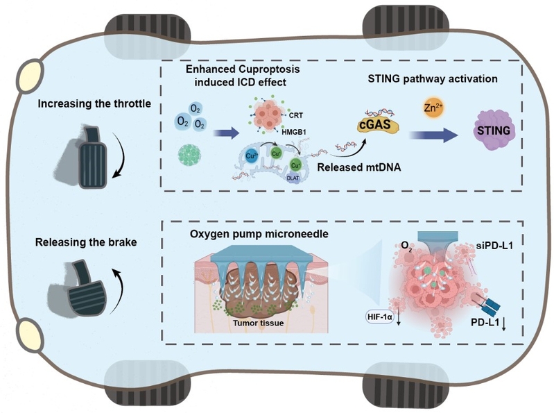 为了克服这些挑战,开云电竞网址医药学院、海洋药物教育部重点实验室赵峡教授团队构建了一种新型的锌掺杂硫化铜纳米花氧泵微针(OPMNs-ZCS@siPD-L1),通过“铜锌协力”激活STING通路并诱导免疫原性死亡(ICD)效应(“踩油门”策略),并通过siPD-L1逆转肿瘤免疫抑制微环境(TME)和OPMNs缓解乏氧(“松刹车”策略),显著增强了肿瘤的免疫治疗效果(图1)。