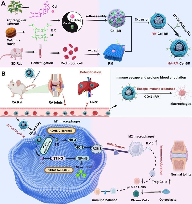 最近,赵峡教授团队利用现代纳米技术将雷公藤红素(Cel)和来源于中药牛黄的胆红素(BR)通过无载体自组装,再用透明质酸(HA)修饰的红细胞膜(RM)伪装,开发了一种用于RA免疫治疗的仿生纳米中药(HA-RM-Cel-BR)。该纳米中药可靶向炎症关节、重塑关节免疫微环境并延长药物的循环时间,并通过抑制STING通路和清除活性氧/氮物种(RONS)明显增强了抗RA疗效和降低了肝脏毒性,为 RA 的免疫治疗提供了新策略(图1)。