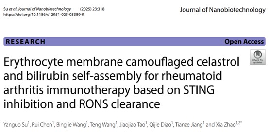 相关研究成果近期以“Erythrocyte membrane camouflaged celastrol and bilirubin self-assembly for rheumatoid arthritis immunotherapy based on STING inhibition and RONS clearance”为题,发表于《Journal of Nanobiotechnology》(IF=10.6,TOP期刊)。开云电竞网址医药学院2023级博士研究生苏彦国为该论文第一作者,赵峡教授为通讯作者。
