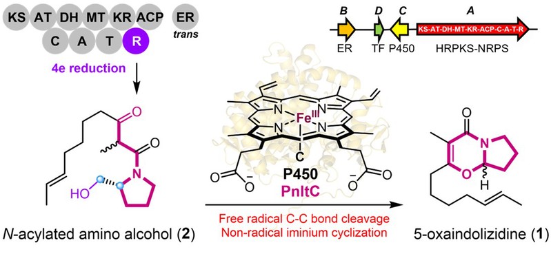 真菌5-氧杂吲哚里西啶生物碱是一类独特的杂环天然产物,根据其核心结构特征,该家族化合物可主要分为两个主要亚型(图1)。Penicilactam A(1),首次报道分离自Penicillium brevicompactum,是一种由真菌产生的生物碱类化合物,具有独特的5-氧杂吲哚里西啶核心结构,并具有潜在的杀虫活性。然而,该化合物的化学合成产率低、步骤繁琐,制约了该分子的深入开发与应用。为解决这一问题,研究人员从橘青霉(Penicillium citrinum)HDN11-186基因组中挖掘负责化合物1生物合成的基因簇pnlt。该基因簇中,杂合型聚酮合酶-非核糖体肽合成酶(PKS-NRPS)首先组装出N-酰基-D-脯氨酸中间体scalusamide A(2)。随后,单一细胞色素P450酶PnltC直接催化其转化为具有5-氧杂吲哚里西啶核心的Penicilactam A(1)(图1)。