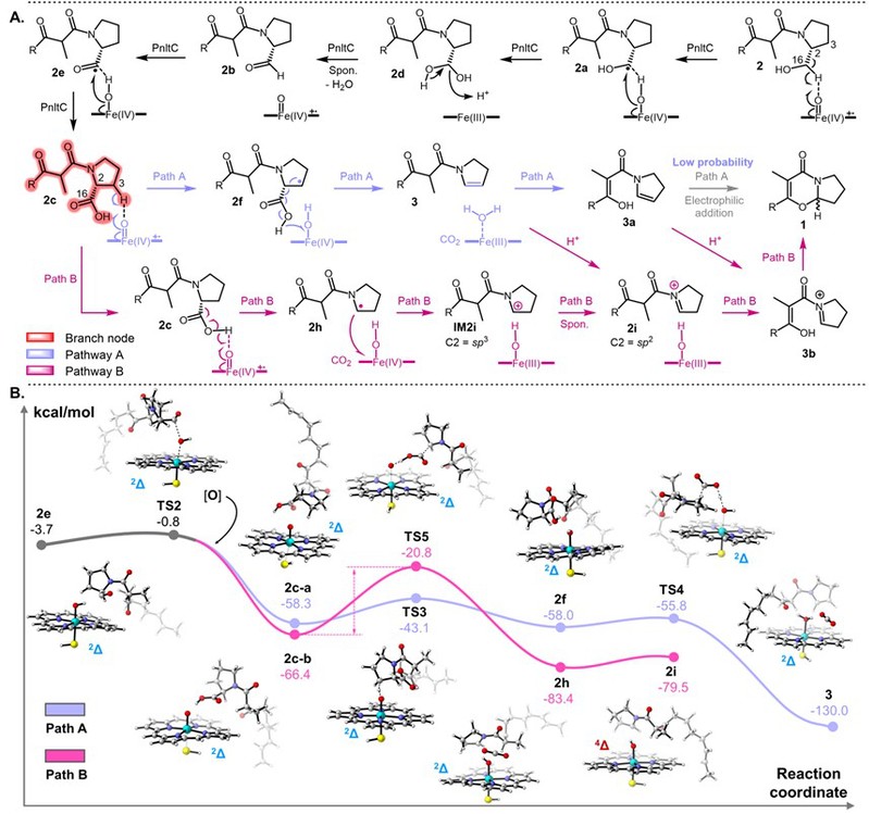 通过对化学合成的中间体及结构类似物进行底物饲喂、STAB还原捕获亚胺阳离子实验,证实了1中5-氧杂吲哚里西啶核心骨架的生成依赖于P450氧化酶PnltC催化的连续氧化脱羧,且在反应过程中存在亚胺阳离子中间体。随后,基于推测路径的DFT计算以及点突变实验,进一步推测了P450酶PnltC的催化机制(图2)。其可以催化自由基参与的C−C键断裂,同时利用亚胺阳离子存在时的非自由基亲核环化实现最终骨架的构建。