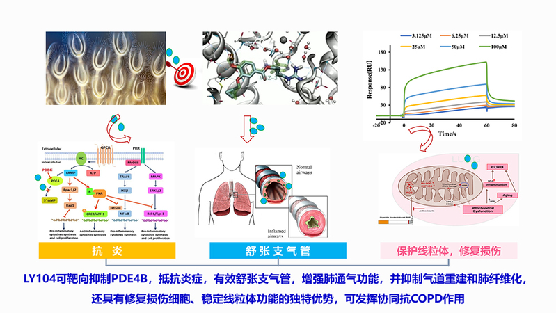 系统临床前研究数据显示,LY104具备良好成药性,既能通过舒张支气管直接缓解呼吸困难症状,又可通过抑制肺部炎症反应改善肺功能,也能借助调节组织代谢机制对受损肺细胞实现一定的修复作用,形成“对症+对因”的双重药理机制。