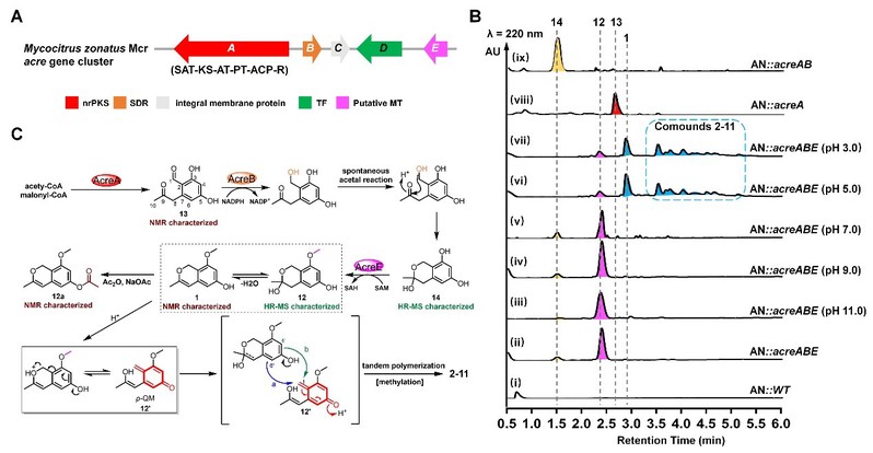 课题组从海洋真菌Mycocitrus zonatus Mcr中鉴定了一个负责p-QM生成的生物合成基因簇(acre)。研究发现,该基因簇编码的非还原性聚酮合酶(AcreA)和短链脱氢酶/还原酶(AcreB)共同合成具有双反应潜力的2,4-二羟基苯甲醇前体。关键的是,一种新型膜依赖性甲基转移酶AcreE能够区域选择性地对该前体的邻位羟基进行甲基化修饰,从而阻断o-QM的生成路径,并引导其专一性地形成p-QM中间体(图2)。该p-QM中间体随后通过迭代的分子间1,6-共轭加成反应,形成一系列结构多样的寡聚产物。
