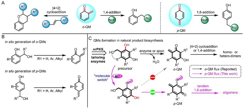 醌甲基化物(Quinone methides,QMs)是一类具有共轭醌式亚甲基结构的高活性中间体,兼具亲电与亲核特性,广泛应用于有机合成与天然产物生物合成中(图1)。然而,其固有的不稳定性及缺乏可控的生成方法限制了其进一步应用。尤其在生物合成中,尽管邻位醌甲基化物(o-QM)的生成路径已较为明确,但对位醌甲基化物(p-QM)的专一性生成路径仍不清楚。