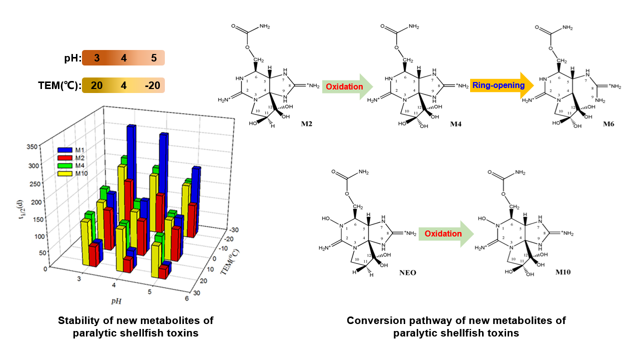 2020年2月5日,Journal of Agricultural and Food Chemistry发表题为“Conversion and stability of new metabolites of paralytic shellfish toxins under different temperature and pH conditions”的研究论文,证实了麻痹性贝毒新型衍生物M1→M3→M5、M2→M4→M6和NEO→M10的化学转化途径;发现实验条件下pH、温度越低,M-toxins越稳定;相比于PST常见组分,M-toxins的稳定性较差。