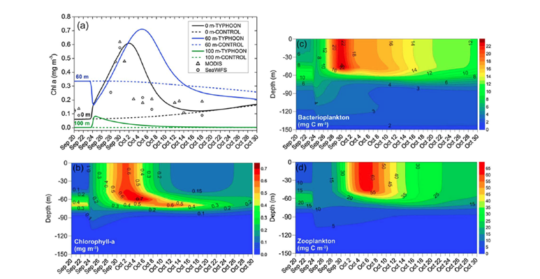 2017年1月4日,地学领域权威期刊Journal of Geophysical Research-Biogeosciences发表了题为“Contributions of physical and biogeochemical processes to phytoplankton biomass enhancement in the surface and subsurface layers during the passage of Typhoon Damrey”的研究论文,定量解析了台风“戴维”经过南海时表层和次表层初级生产过程的变化机制,为充分认识台风对海洋生物地球化学循环过程的影响提供理论依据。