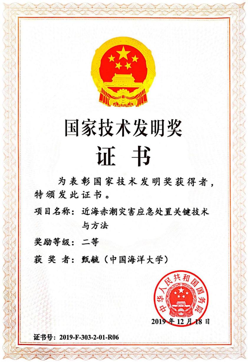 2019年12月18日,实验室甄毓老师获得国家技术发明二等奖,获奖成果名称为“近海赤潮灾害应急处置关键技术与方法”。该奖项主要授予应用科学技术知识做出产品、工艺、材料及其系统等重大技术发明的中国公民。甄毓老师致力于近海赤潮灾害的防治和技术研究,发明了应急处置的关键技术与方法。
