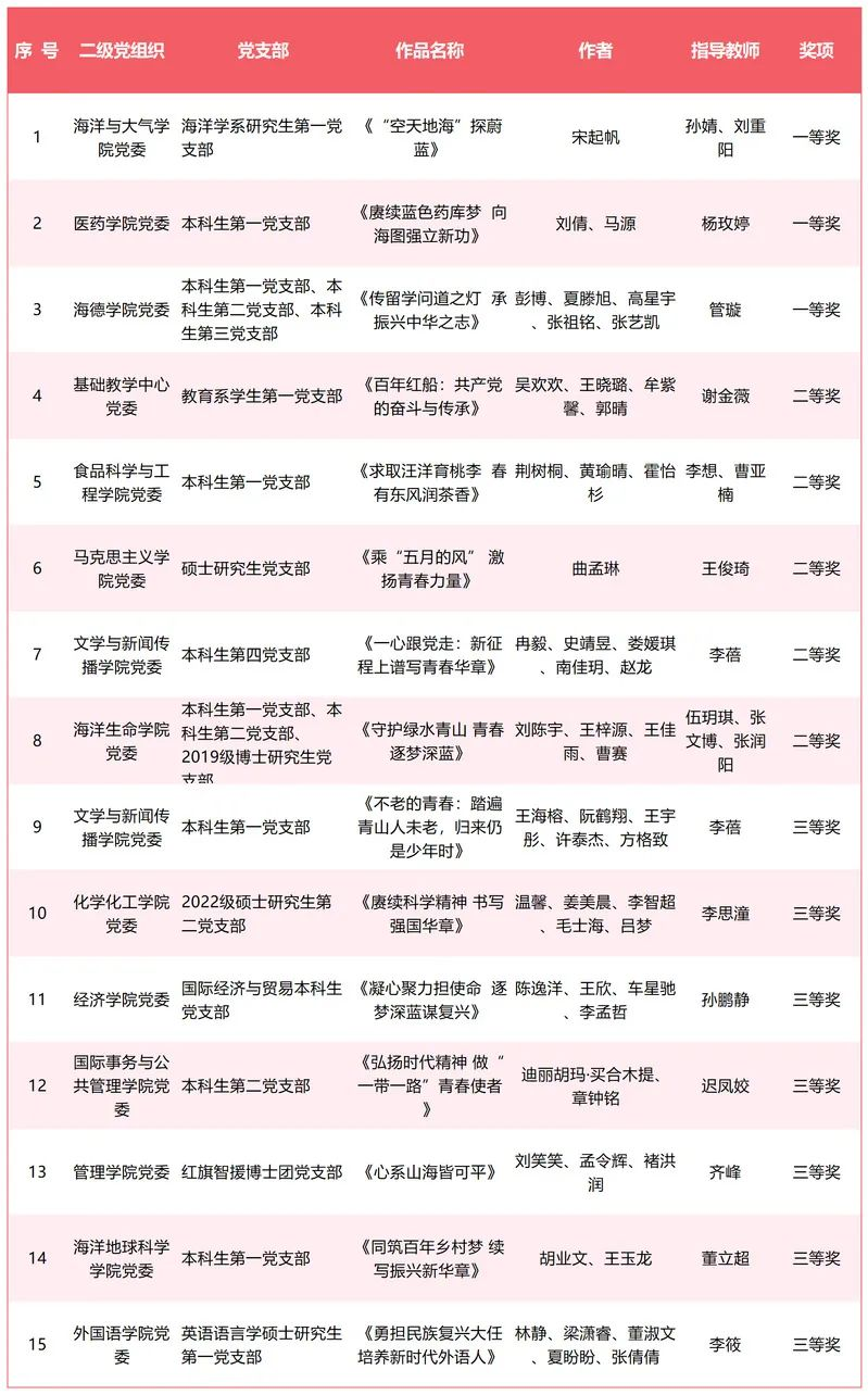 其中,学院教工第三党支部作品《海纳百川 命运与共》结合新时代的青岛实践讲述人类命运共同体理念,阐释人类命运共同体理念中蕴含的中华优秀传统文化底蕴与科学理论依据,获教工组一等奖,将被纳入学校党员教育课程库,作为入党教育培训课程。学院硕士研究生党支部《乘“五月的风”激扬青春力量》获学生组二等奖。学院教工第二党支部作品《中国共产党的诞生,为什么要从“五四”开始讲》入选中组部“党课开讲啦”精品党课展播。