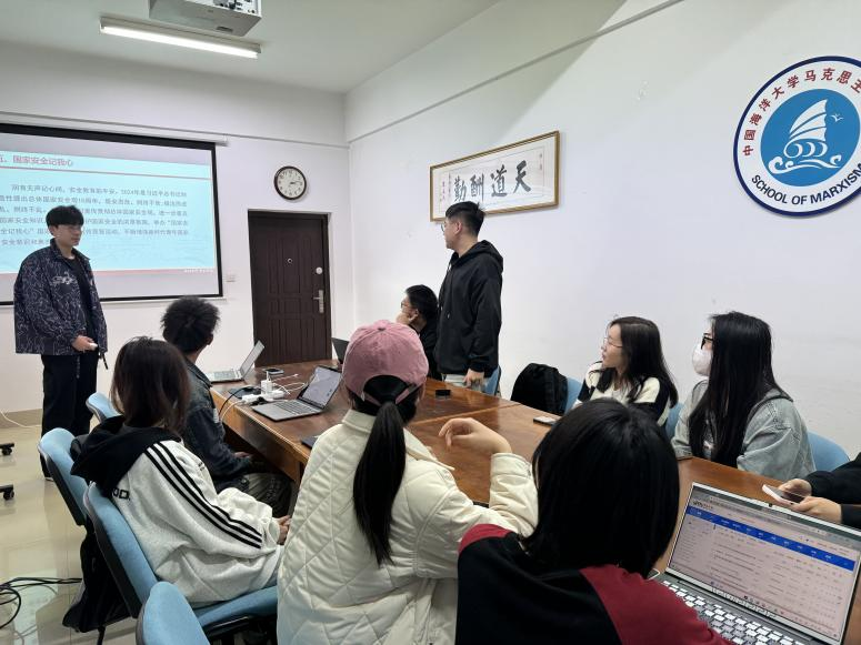 2023级团支部在团支部书记张聪的带领下,集体学习了习近平总书记关于坚持总体国家安全观的相关论述,重点谈及文化安全的重要性,通过对“毒教材”事件的分析,点明我国的文化安全遭遇到了前所未有的严峻挑战,必须引起国人的警醒、国家的高度重视。在文化安全领域,要牢牢掌握意识形态工作主动权,大力培育和弘扬社会主义核心价值观,不断夯实中国特色社会主义思想道德基础。随后,周睿思开展题为“贯彻总体国家安全观,筑牢海洋安全防线”主题宣讲,具体介绍了“海洋命运共同体”理念以及青岛在海洋生态保护、强化海洋灾害防治、严格海洋执法监管等方面做出的努力,进一步提高了团员们的海洋安全意识,坚定了团员们维护海洋安全的坚定信念。最后,2023级团支部组织委员阚昊发言,具体阐述了在维护国家安全领域,公民和组织应当履行的义务,鼓励大家做国家安全的捍卫者。