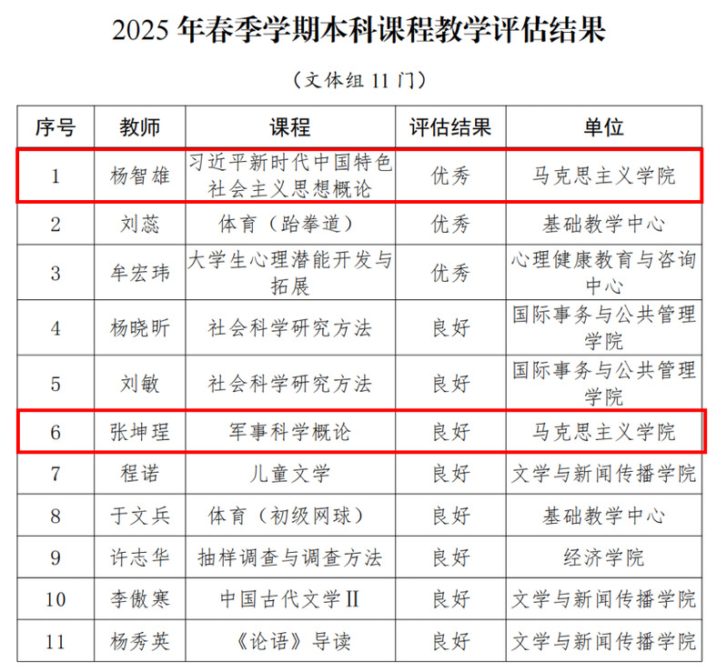 近日,学校公布了2025年春季学期学校本科课程教学评估结果,学院讲师杨智雄所授课程获评优秀,副教授张坤珵所授课程获评良好。