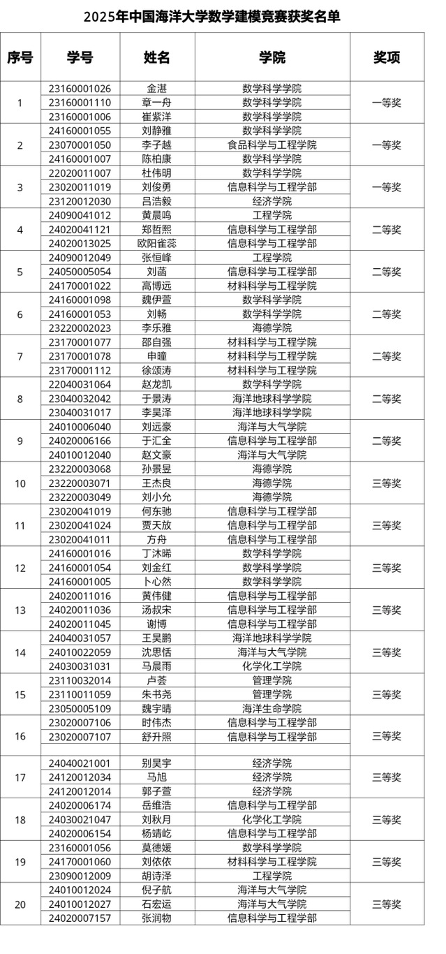 近日,2025年“深圳杯”数学建模挑战赛开云电竞网址校内选拔赛获奖名单正式公布。本次竞赛旨在选拔优秀学生代表学校参加全国高水平数学建模竞赛,共评选出一等奖3项、二等奖6项、三等奖11项,展现出我校学生扎实的数理基础和综合应用能力。具体获奖团队及成员见下图: