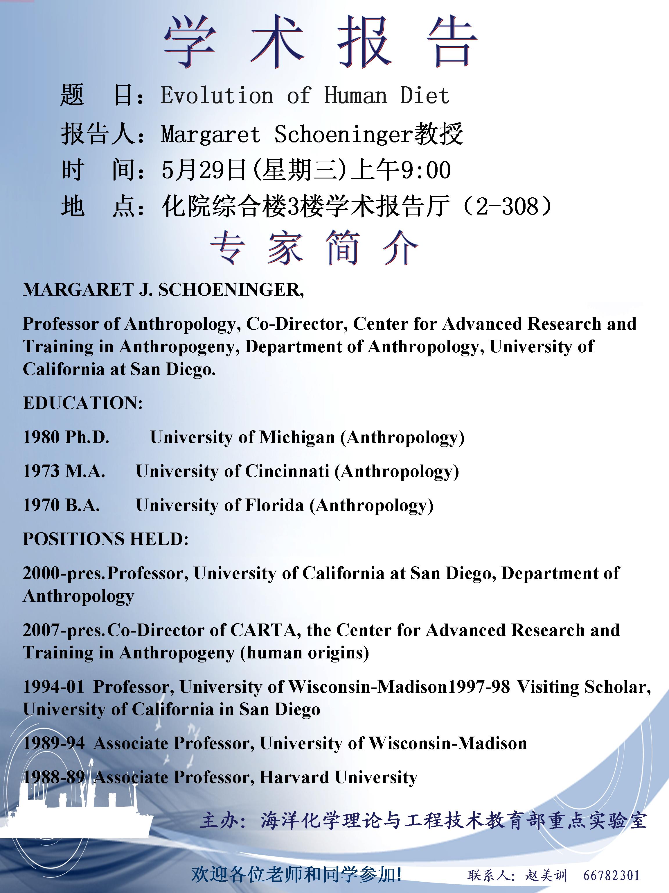 5月29日美国加州大学Margaret Schoeninger教授讲座