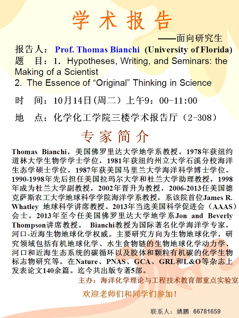 10月13日、14日美国佛罗里达大学Thomas Bianchi教授讲座