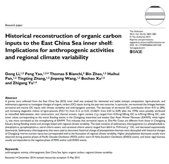 Dong Li, Peng Yao*, Thomas S Bianchi, Bin Zhao, Huihui Pan, Tingting Zhang, Jinpeng Wang, Bochao Xu, Zhigang Yu. Historical reconstruction of organic carbon inputs to the East China Sea inner shelf: implications for anthropogenic activities and regional climate variability. The Holocene, 2015, 25(12): 1869–1881.