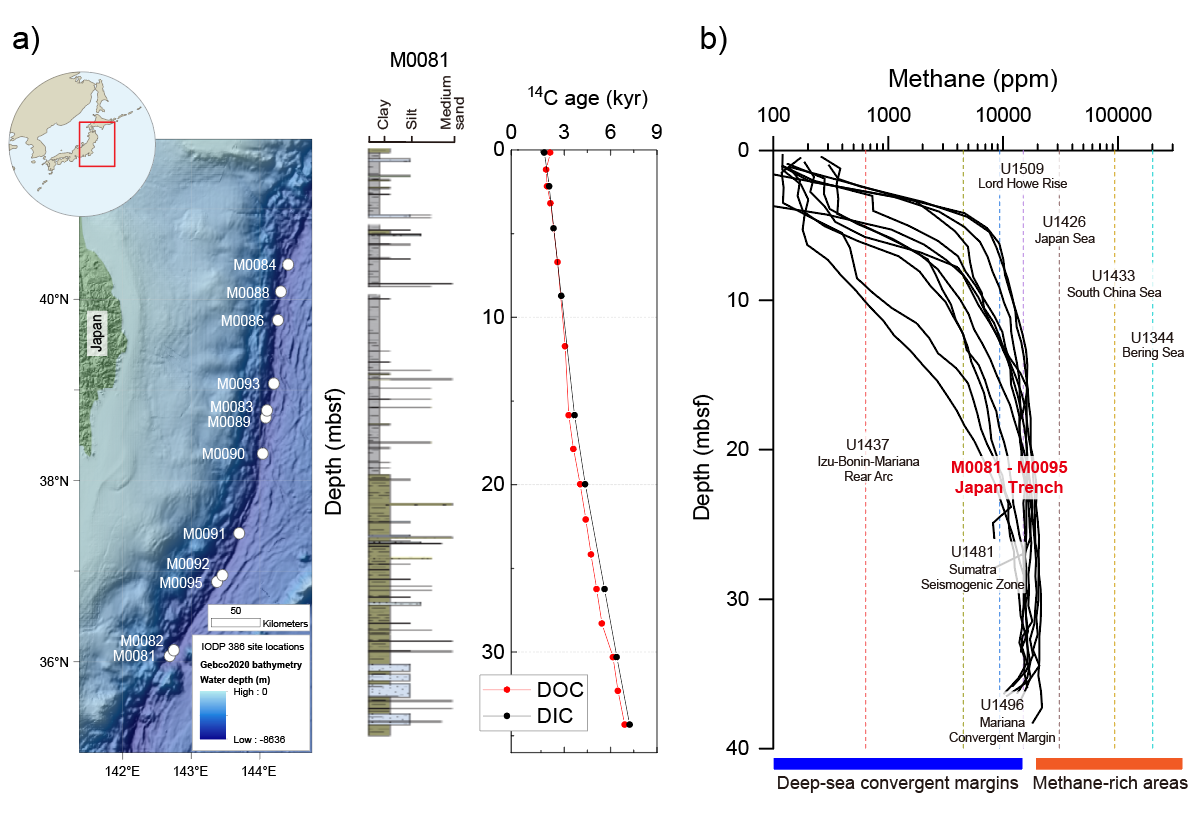 图1 a) 深渊沉积物中溶解碳特征(以81号站位为例)b)以及甲烷含量。