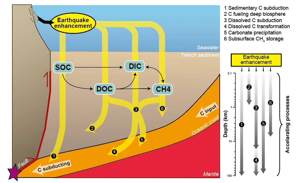 图2地震促进了海沟碳转化和深部碳循环。浊流带来的颗粒有机碳被降解为溶解有机碳和无机碳,在深海中积累并支持深部生命活动。碳以多种形式正加速向地球深部俯冲。